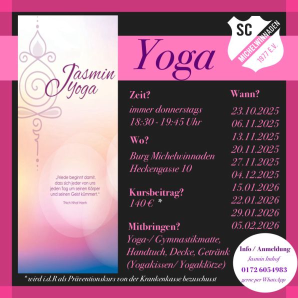 Lass dich von Yogakurslehrerin YZU Jasmin Imhof begleiten und finde innere Ruhe und erlebe neue Energie. Yoga hilft dir Verspannungen zu lösen und den Stress des Alltags zu reduzieren.