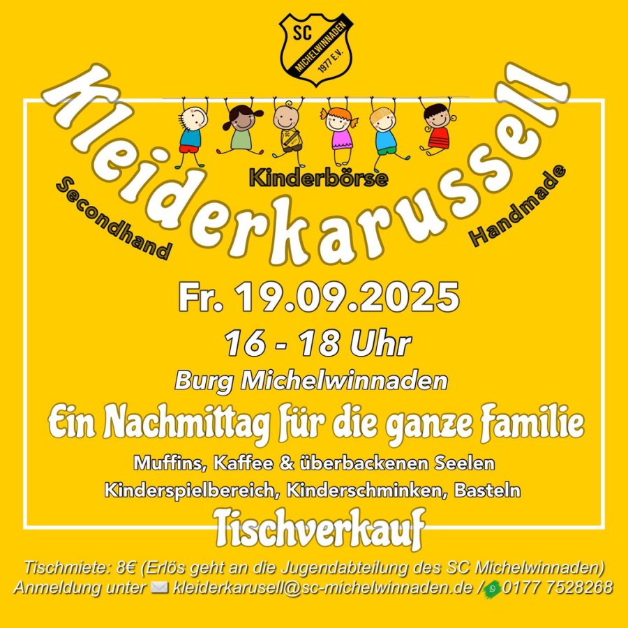 Nach den Sommerferien am Freitag, den 19.09.2025 lädt der SC Michelwinnaden, zu „Kleiderkarussell“ der Kinderbörse für Selbstverkäufer ein. Von 16 bis 18 Uhr haben Eltern die Möglichkeit, in der Burg in Michelwinnaden gebrauchte Kindersachen und weitere Ausstattung zu kaufen. Ein besonderes Highlight ist der Erwerb von „Handmade“ bzw. selbstgemachte Produkte kreativer Handwerker. Mit dabei sind „Nadel & Faden”, „Klein_Lausemaus, sowie Glückwunschkarten. Doch der Freitagnachmittag soll nicht nur dem Einkaufen dienen, sondern der ganzen Familie: Im Sportheim werden überbackene Seelen, Kaffee und Muffins angeboten. Zudem erwartet die kleinen Besucher ein Kinderspielbereich mit Basteln, Malen und Kinderschminken. Das Kleiderkarussell verspricht somit nicht nur ein Einkaufserlebnis, sondern auch einen unterhaltsamen Nachmittag für die ganze Familie, perfekt geeignet als Wochenendstart.